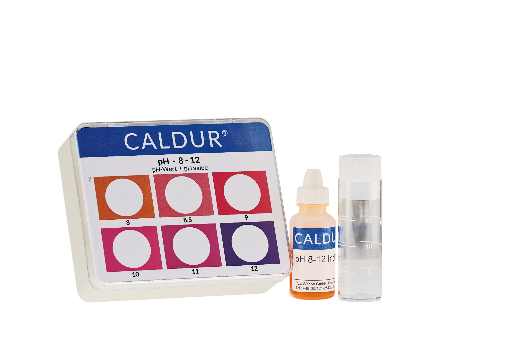 Das CALDUR® pH 8-12 Testset – Colorimetrisch verwendet einen Mischindikator, der je nach pH-Wert der Probe eine charakteristische Farbe annimmt. Nach Zugabe von einem Reagenz zur Wasserprobe wird die Farbe innerhalb von 1 Minute mit der mitgelieferten Farbkarte verglichen.