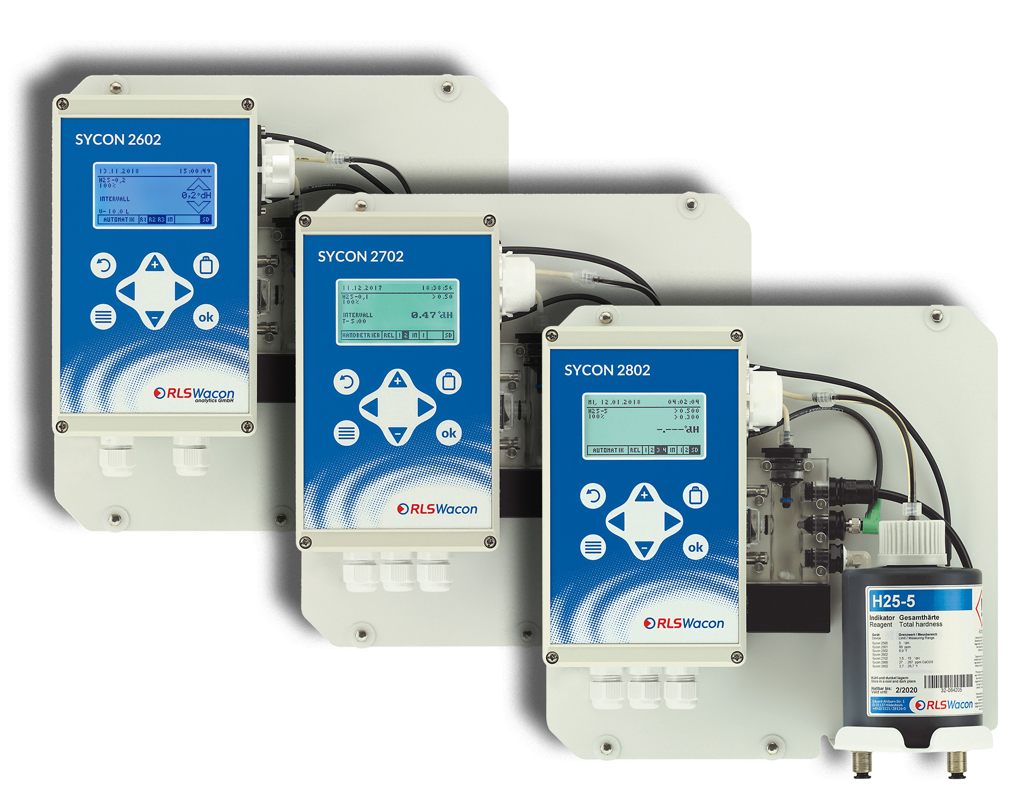 - SYCON 2702 & 2802 – arbeiten nach der kolorimetrischen Titrationsmethode: Der Indikator wird schrittweise zudosiert. Aus dem Farbumschlag während der Zugabe berechnet das Gerät die exakte Konzentration des Wasserinhaltsstoffes.